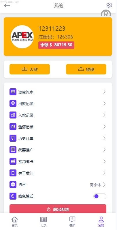 前端UI经过重构,支持繁体、英文和简体三种语言。系统以外汇交易为主,具备正常的K线显示、提现限制、以及一键冻结金额等功能。