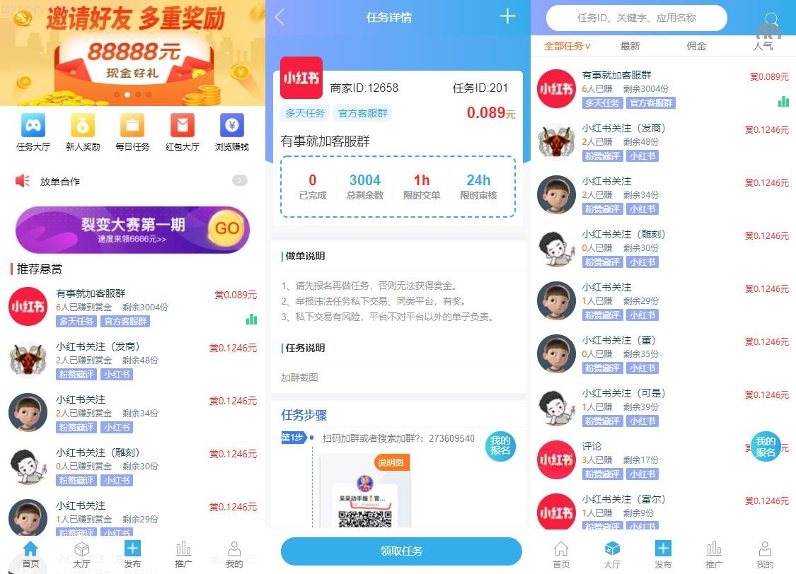 全新开发的悬赏任务兼职系统,仿照蚂蚁帮扶众人帮平台设计,功能全面,包括接单、发布任务、店铺关注、置顶推荐、排行榜、红包大厅、红包抽奖、任务步骤说明、微信绑定、分销推广、举报维权、VIP会员特权等功能。已有客户成功上线运营,并支持微信绑定登录,同时附带APP推广页面。