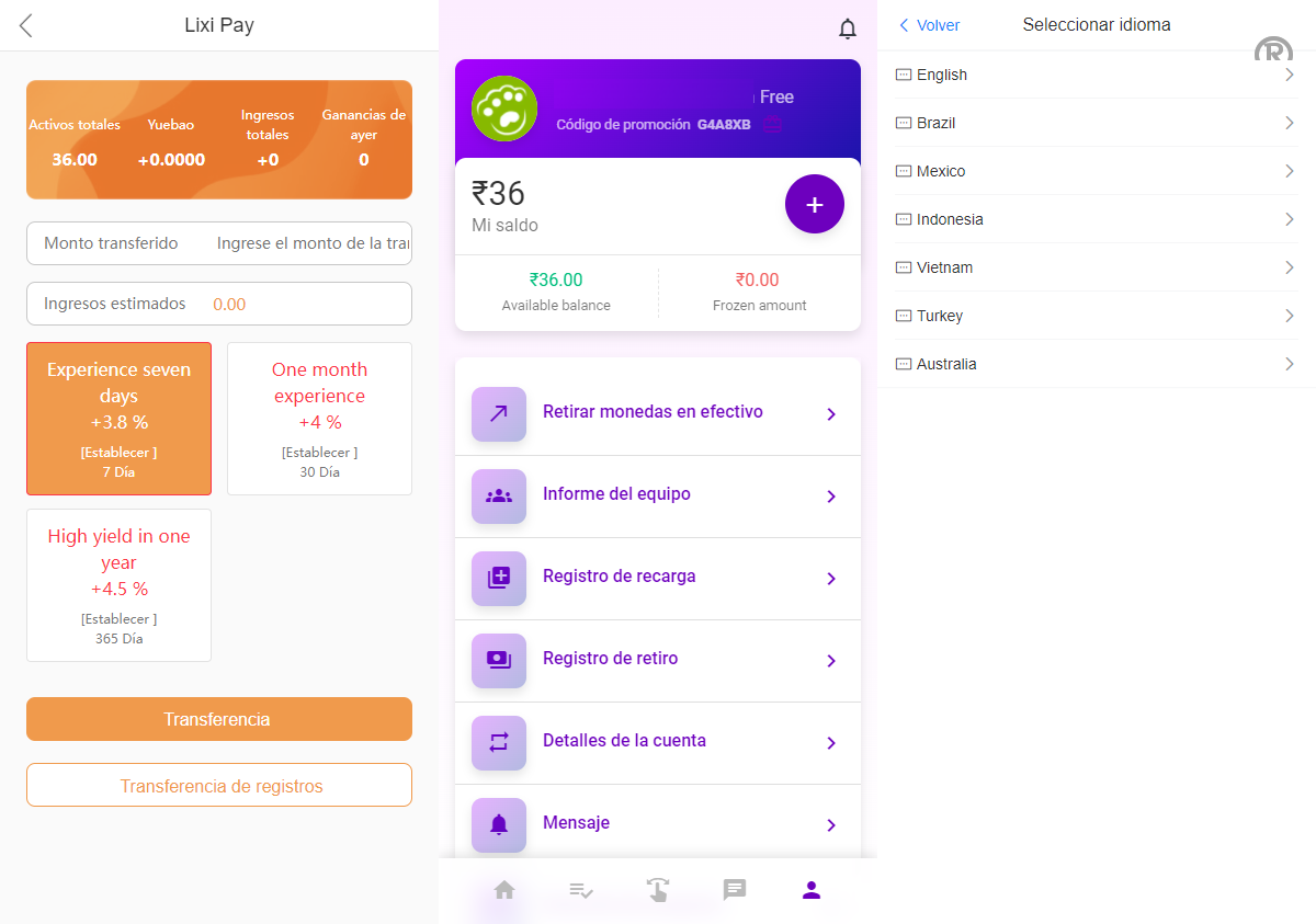 后台釆取全新框架,余额宝分为定数时间,一天,七天,一个月,一年,合约到就会产生收益。