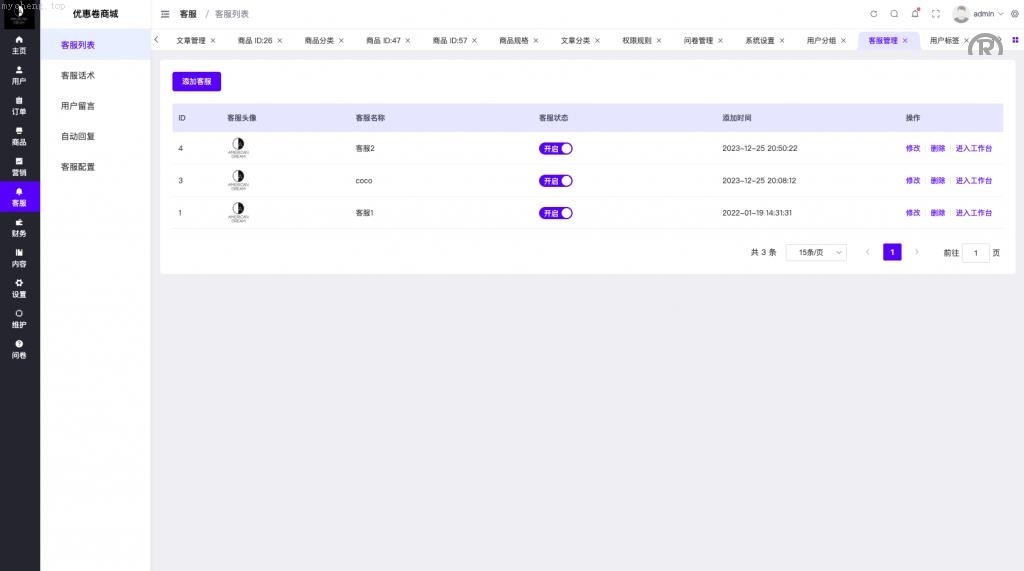 最新的优惠券回收商城,内置客服功能,支持多种语言。系统流畅丝滑,内置跳转调查问卷,若不需要可通过代码注释关闭。管理后台支持双语切换,包含中文和越南语版本。如有需要请联系客服。